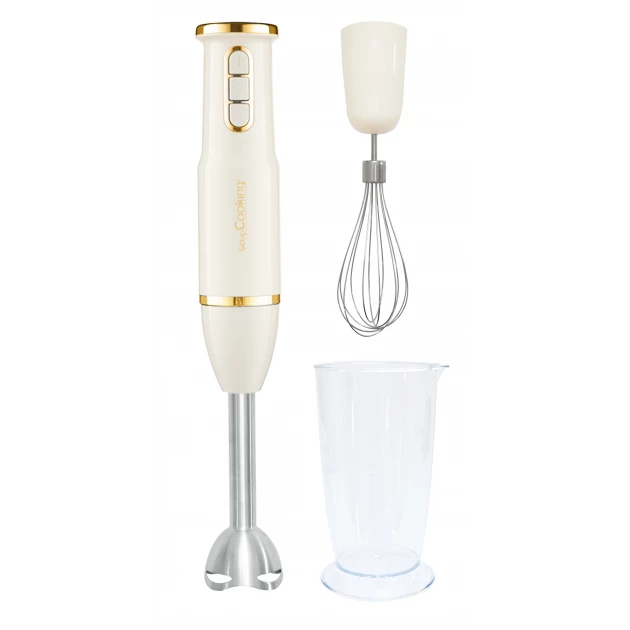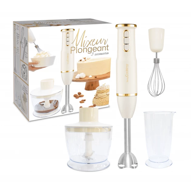 Simple d’utilisation, ce mixeur plongeant répondra à toutes vos attentes. D’une dimension de 42 cm de long pour 5,5 cm de diamètre, le mixeur Scrapcooking est livré avec plusieurs accessoires. Vous retrouverez ainsi un verre doseur en plastique de 700 ml, un broyeur ainsi qu’un fouet inox. La particularité de ce mixeur plongeur est qu’il dispose également d’un hachoir de 500 ml avec des lames en inox.