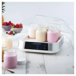 Réalisez vos laitages maison à l’aide de la Yaourtière Lagrange. D’une puissance de 16 watts, elle vous permettra de réaliser 9 yaourts en une fois. La yaourtière Lagrange s’accompagne de 9 pots en verre dont le volume est de 185 g. Afin de remplir tous les pots, il vous faudra 1.5 L du lait de votre choix. Grâce à l’écran tactile, la programmation devient très intuitive. Afin de gagner du temps, la yaourtière 9 pots Lagrange vous propose une programmation jusqu’à 15h00.